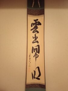 2025年8月10日 / 最終更新日 : 2025年8月18日 sehbi-an 掛け物・禅語 雲出洞中明 雲出洞中明(雲出でて洞中(とうちゅう)明らかなり) 雲が晴れて、それまで暗かった洞窟の中を照らすようになった様です。 雲は煩脳のことで、悟りの境地に達した状況を示します。 『大灯国師語録』巻下が出典になります。 胥云、吽。(雪消山骨露)竇、便辭退。(雲出洞中明)竇、在明州。 (胥(しょ)云く、吽。(雪消えて山骨露われ)竇(ちょう)、便ち辞退す。(雲出でて洞中明らかなり)竇、明州に在り。) 今悩んでいることもいずれは晴れて健やかになることでしょう。 Follow me! おすすめの関連記事はこちらです。あわせてどうぞ。本日は7の日、秋の七草をどうぞ風鈴仕覆のための養生紙製道具箱一花開天下春名竹芸家 二代瓢阿巣籠 FacebooktwitterHatenaPocket コメントを残す コメントをキャンセルメールアドレスが公開されることはありません。 ※ が付いている欄は必須項目ですコメント ※ 名前 ※ メール ※ サイト 次回のコメントで使用するためブラウザーに自分の名前、メールアドレス、サイトを保存する。
