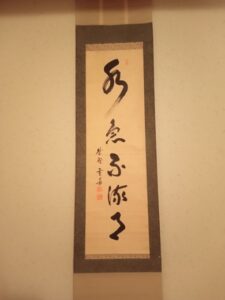 2025年8月11日 / 最終更新日 : 2025年8月18日 sehbi-an 掛け物・禅語 水急不流月 水急不流月(水 急にして 月を流さず) たとえどんなに水が急な流れでも、川面に映る月明かりまで流されることはありません。時代の変化で価値観や流行などが遷移していきますが、いたずらにそれに流されるのではなく、きちんと信念を持って生きていくことは重要であると思われます。 出典の確証はないようです。 急流でもながされない月のような光になりたいものです。 Follow me! おすすめの関連記事はこちらです。あわせてどうぞ。古瀬戸の系譜の考察茶杓 成瀬宗巨作 銘 煙雨 看々臘月尽松樹千年翠経営の神様サイコロ茶会 主題「茶の建物」に参加して FacebooktwitterHatenaPocket コメントを残す コメントをキャンセルメールアドレスが公開されることはありません。 ※ が付いている欄は必須項目ですコメント ※ 名前 ※ メール ※ サイト 次回のコメントで使用するためブラウザーに自分の名前、メールアドレス、サイトを保存する。