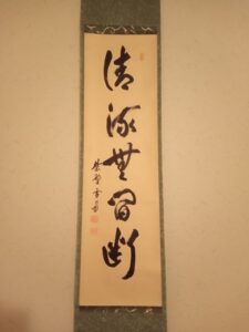2025年8月13日 / 最終更新日 : 2025年8月19日 sehbi-an 掛け物・禅語 清流無間断 清流無間断(清流に間断無し)は、よく茶席に掛けられます。 清らか水は澱むことなく絶えず流れている様を示しています。 不断の精進は継続するが故に結果を生み出しているのです。 『普燈録』が出典です。 問。如何是廣德境。曰。清流無間断。碧樹不曾凋 (問う、如何なるか是、廣德の境。曰く、清流に間断無し。碧樹曾て凋まず) 一度怠けると元の状態に戻すのも大変ですね。 Follow me! おすすめの関連記事はこちらです。あわせてどうぞ。紅炉一点雪文士 立原正秋茶の湯における分子生物学および進化論的な考察月点前のウグイスとは織部焼に潜む時代精神の考察柳原白蓮 短冊「あつき日の空にうこけるくろき雲 いさゝか雨をこほしてゆきぬ」 FacebooktwitterHatenaPocket コメントを残す コメントをキャンセルメールアドレスが公開されることはありません。 ※ が付いている欄は必須項目ですコメント ※ 名前 ※ メール ※ サイト 次回のコメントで使用するためブラウザーに自分の名前、メールアドレス、サイトを保存する。